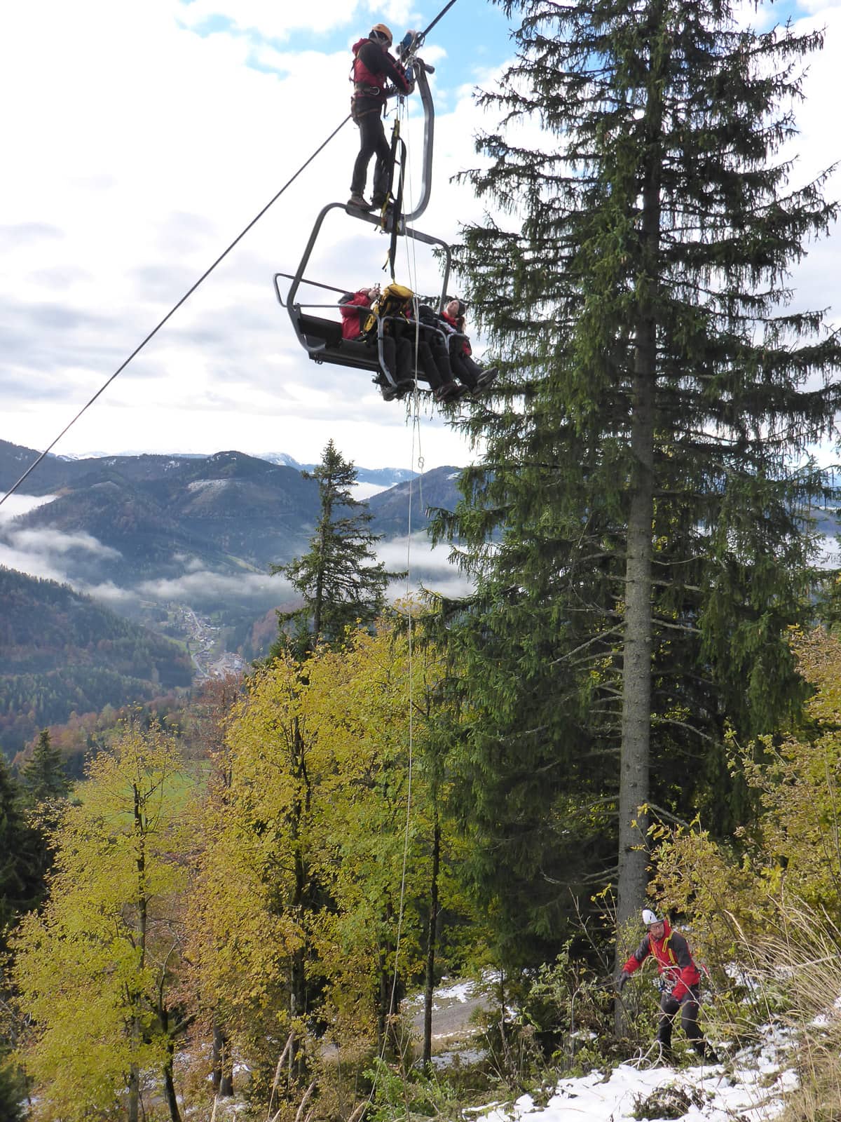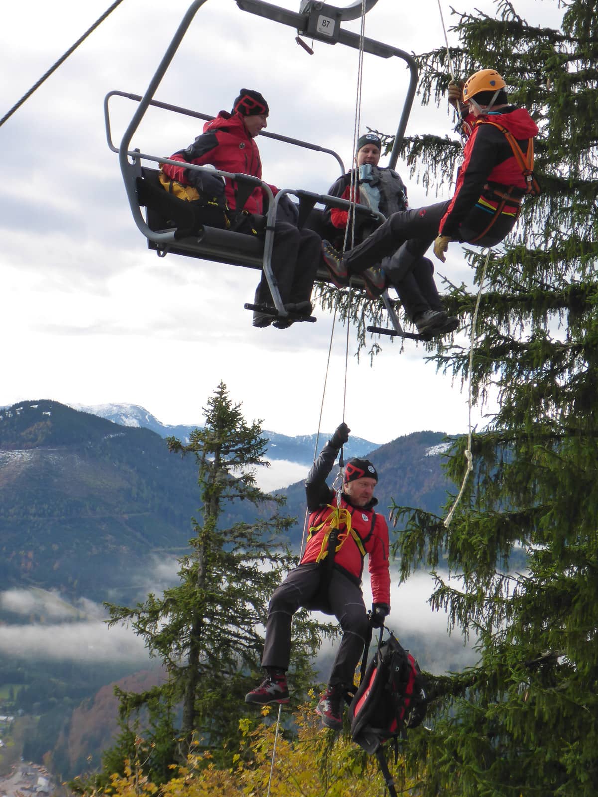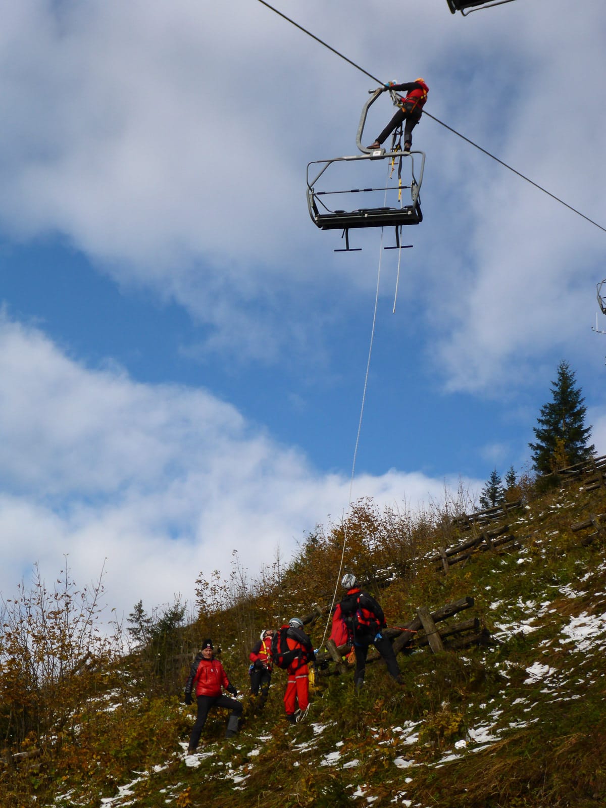 Rasch und sicher soll es ablaufen, damit alle Personen wieder heil ins Tal kommen. Damit dies gewährleistet ist muss jeder Handgriff sitzen und jeder hat seinen Posten. Da wäre der Retter selbst, der sich von Sessel zu Sessel arbeitet, und sein Sicherungsteam, welches Ihn und die zu Rettenden sichert und abseilt. Nicht zu vergessen noch die Bodenmannschaft die für den sicheren Abtransport zuständig ist, weil nicht jeder Liftbenützer landet auf der Piste bzw. direkt am Wanderweg.