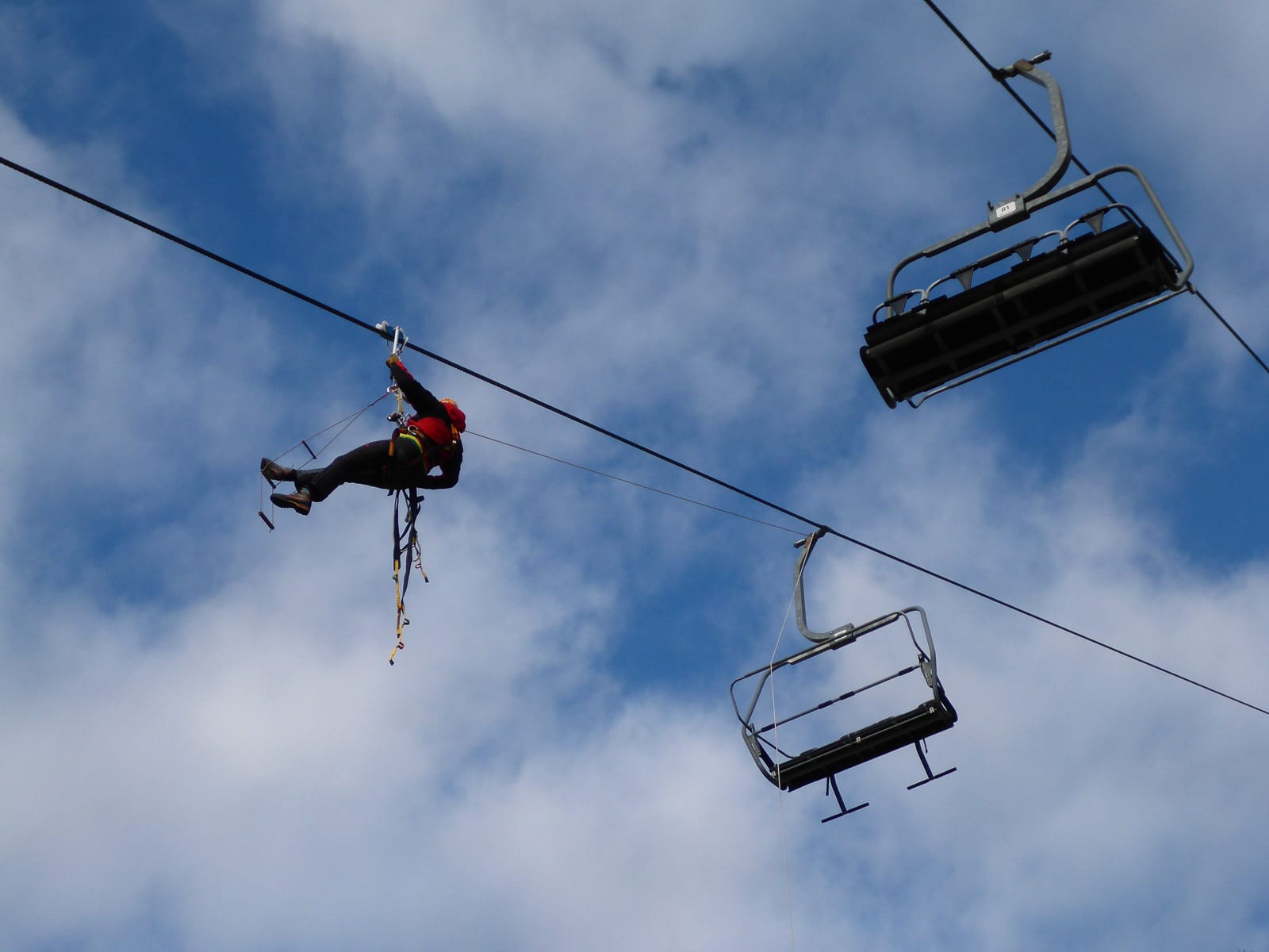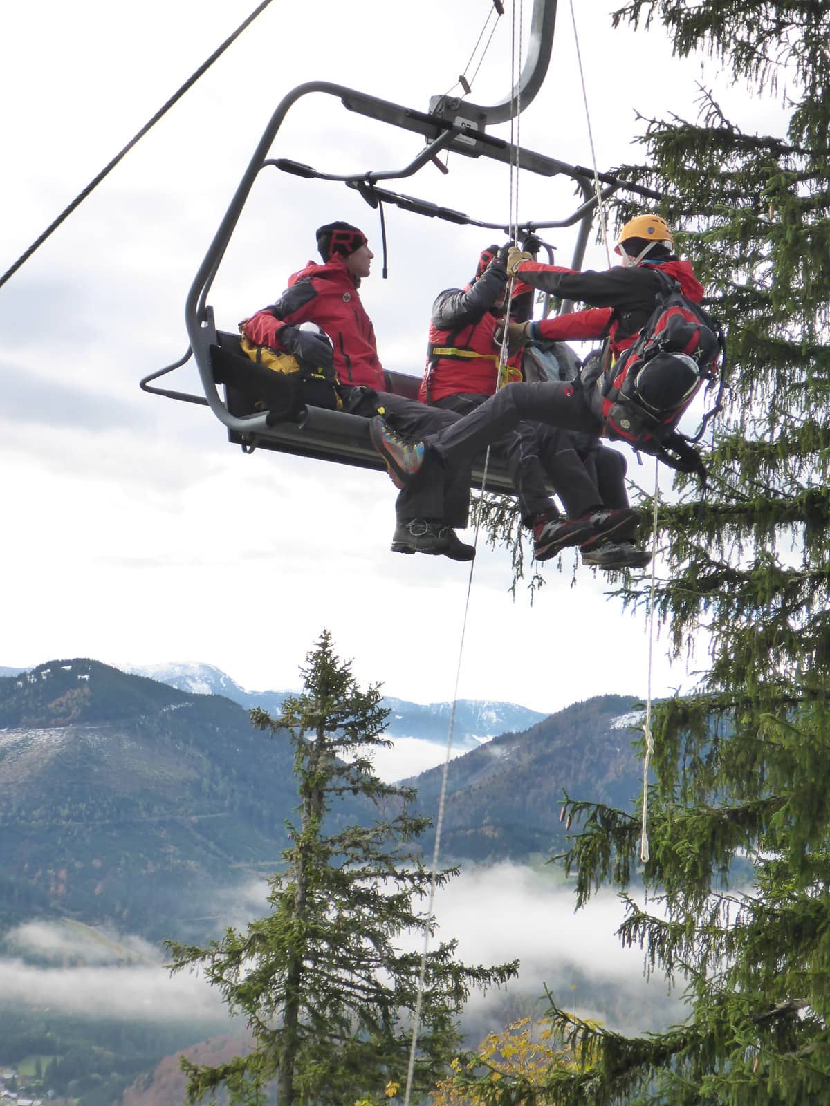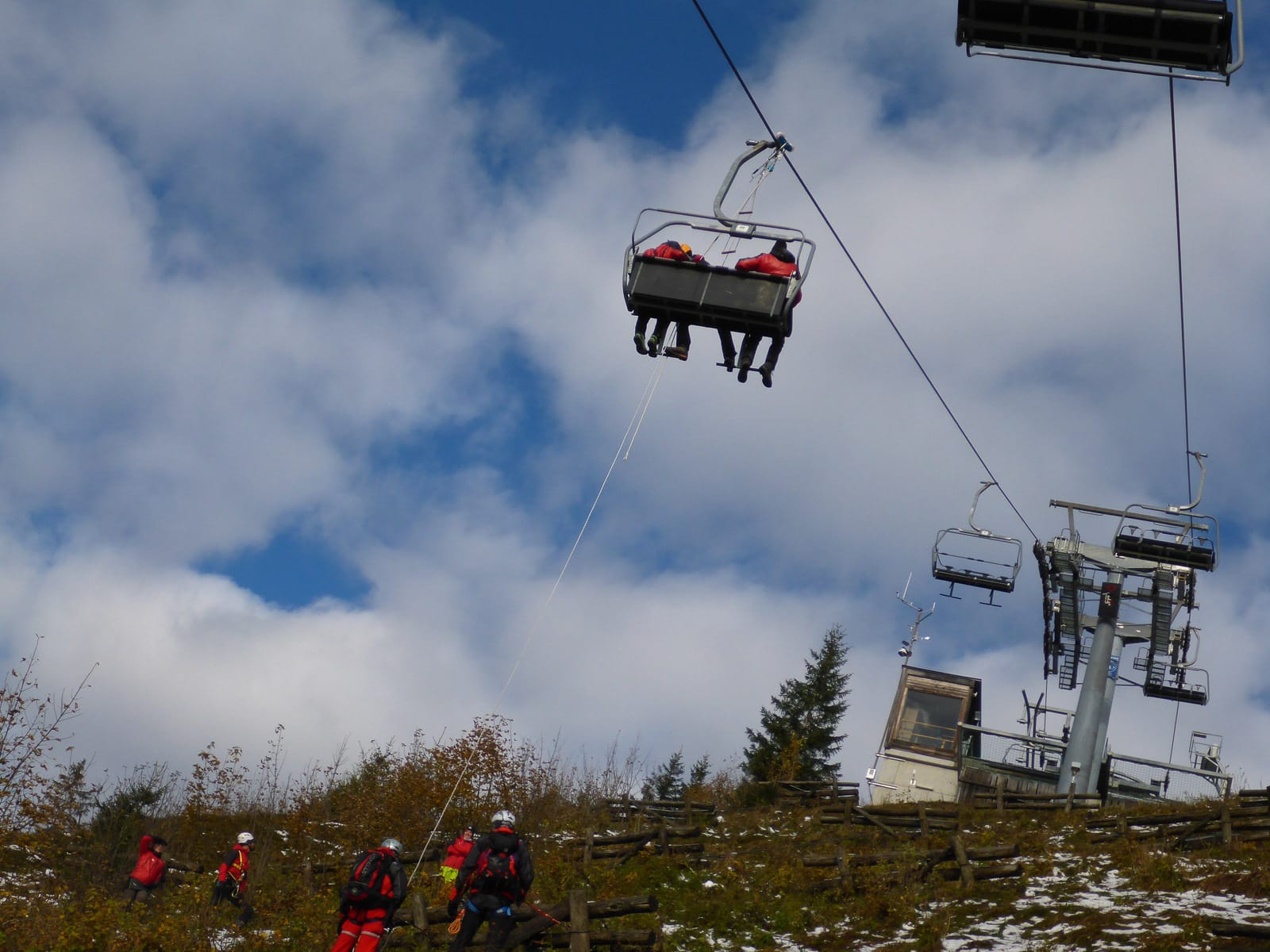 Rasch und sicher soll es ablaufen, damit alle Personen wieder heil ins Tal kommen. Damit dies gewährleistet ist muss jeder Handgriff sitzen und jeder hat seinen Posten. Da wäre der Retter selbst, der sich von Sessel zu Sessel arbeitet, und sein Sicherungsteam, welches Ihn und die zu Rettenden sichert und abseilt. Nicht zu vergessen noch die Bodenmannschaft die für den sicheren Abtransport zuständig ist, weil nicht jeder Liftbenützer landet auf der Piste bzw. direkt am Wanderweg.