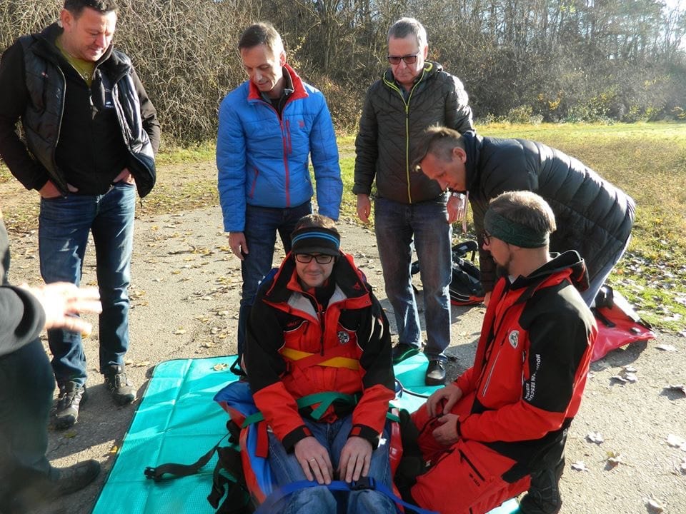 Thomas Kaltenecker vom SAN-Referat der Bergrettung NÖ/Wien frischte in einem 8-stündigen intensiven Programm die Kenntnisse in Theorie und Praxis wieder auf. Insgesamt nahmen 14 Bergretter und Bergretterinnen aus 4 Ortsstellen teil. Nach dem Theorie-Block am Vormittag und einigen praktischen Übungen zum Thema Verbände ging es am Nachmittag nach draußen, wo einige Szenarien mit der UT2000 sowie die praktische Anwendung mit dem Tragetuch und der Stifneck geübt wurden.