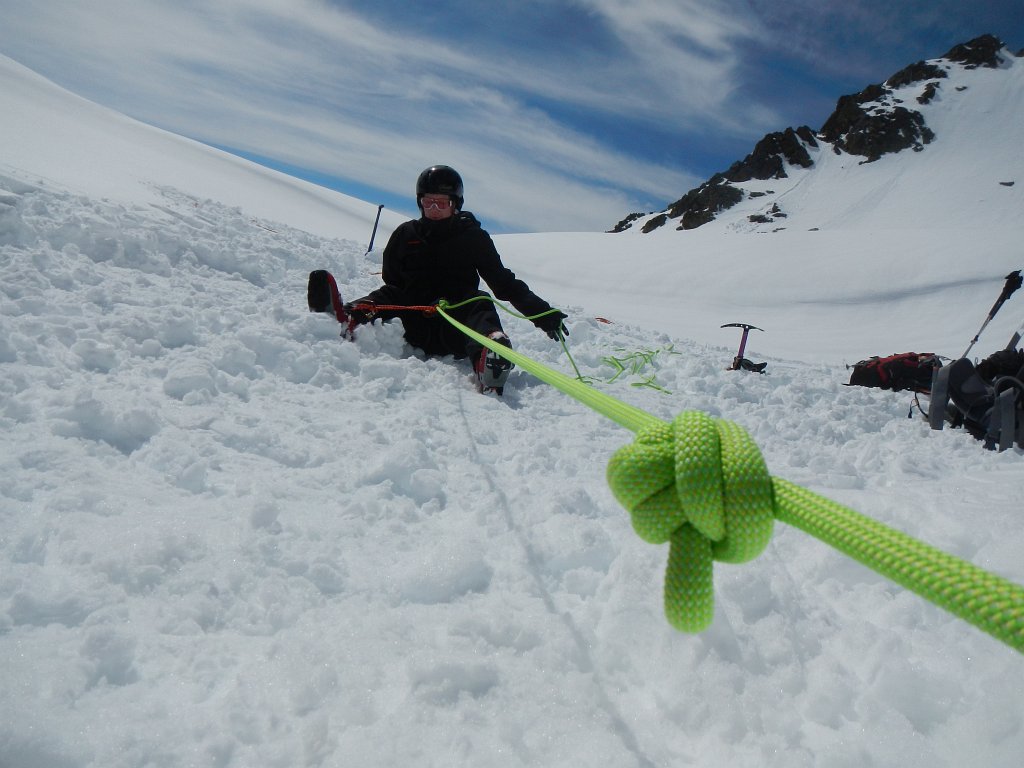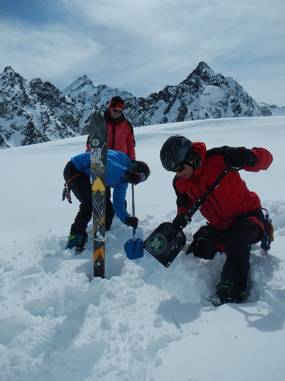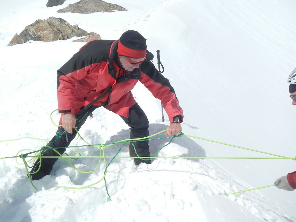 Da über Nacht nur wenige Zentimeter Schnee gefallen waren und bereits wieder die Sonne vom Himmel lachte, marschierten wir diesmal direkt vom Quartier bergwärts los. Erst ins breite Ochsenkar, vorbei an einem vom Vortag stammenden, breiten Lawinenschuttkegel, bis wir im Bereich des Winnebachjoches nach rechts in einen Kessel aufsteigen konnten. Von hier ging’s in einem ausholenden Bogen immer steiler werdend Richtung Gipfel weiter, wo wir wieder knapp darunter das Schidepot errichteten. Nun hieß es noch einen kurzen Steilaufschwung zu Fuß zu überwinden, bevor wir beim Gipfelkreuz auf dem Winnebacher Weißkogel (3182m) standen. Bei der Aussicht befiel den einen oder anderen von uns diese gewisse Sehnsucht, doch länger hier bleiben zu können. Wir hatten jedoch anderes im Sinn. Wir wollten noch die anschließende Abfahrt unterbrechen und wenige Meter oberhalb des Winnebachjoches eine Übungseinheit einlegen. Am Programm stand nun „Spaltenbergung“, was besonders von unseren Neuzugängen zur Ortsstelle mit viel Motivation und Elan geübt wurde. Dann hieß es jedoch von der herrlichen Bergwelt Abschied nehmen, durch mittlerweile etwas tieferem Schnee ins Tal ab- und nach einem letzten gemeinsamen Getränk auf der Sonnenterrasse wieder heimwärts fahren.