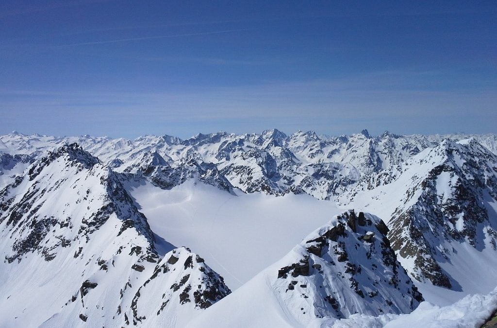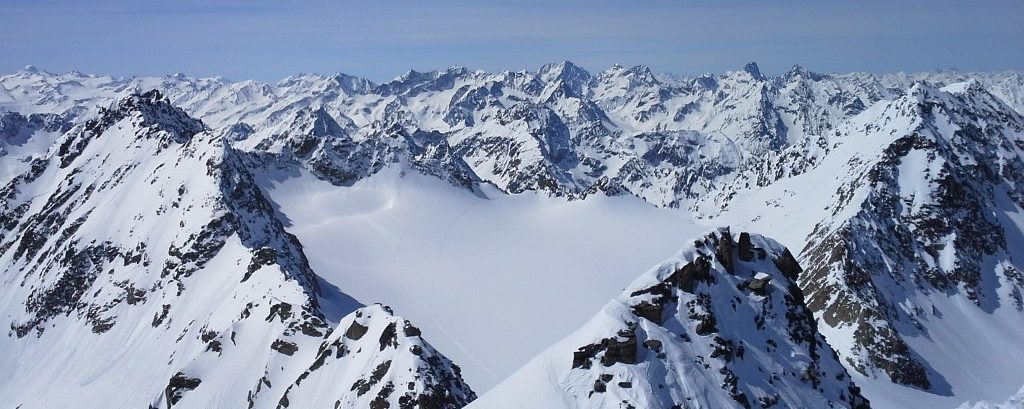 Am Donnerstag reisten wir – insgesamt 6 BergretterInnen der OST St. Pölten – erst mal gemütlich ins Sellrain an und stiegen schwitzend von Lüsens – das Thermometer zeigte um die 20°C an – am Winterweg zum Westfalenhaus auf. Schon die ersten Blicke auf die Bergwelt um uns zeigten, in welch herrlichem Schitourengebiet wir hier unterwegs sein würden, wenn auch die Lawinensituation aufgrund der Neuschneefälle der letzte Tage in Kombination mit den nun recht warmen, vorherrschenden Temperaturen nicht außer Acht zu lassen sei. So entschieden wir uns, am Freitag den Längentaler-Weißer Kogel (3217m) zu besteigen. Dafür begann die Schitour erst mal mit einer Abfahrt von der Hütte ins Längental, in welchem wir dann eher sanft, nur einmal von einem kürzeren Steilaufschwung unterbrochen, aufstiegen und den gleichnamigen Gletscher erreichten. Hier hielten wir uns eher in der Mitte und nun immer steiler werdend ging’s mit einigen Spitzkehren weiter zum Schidepot knapp unterhalb des Gipfels, welchen wir im direkten Aufstieg, den letzten Teil des Gipfelgrates ausnützend, erreichten. Was für eine Fernsicht! Kein Wunder, dass diese Tour als Klassiker gilt. Unsere Blicke wanderten auch immer wieder hinüber zum Hohen Seeblaskogel. Er sollte für den nächsten Tag, wenn die Bedingungen es zuließen, unser Ziel sein. Doch erst hieß es zurück zur Hütte. Schon die ersten Schwünge ließen unser Grinsen immer breiter werden, denn trotz hoher Temperaturen konnten wir diese noch im herrlichsten Pulver ziehen. Da machte selbst der kurze Gegenanstieg zur Hütte keinem von uns mehr etwas aus.
