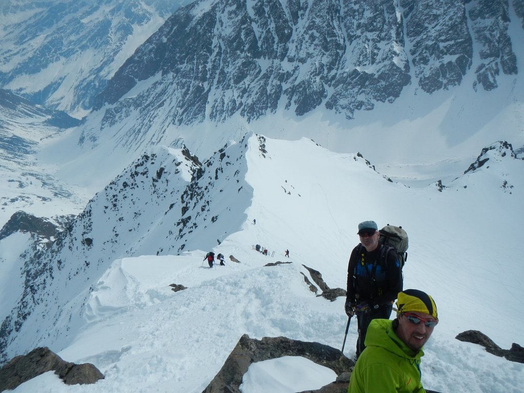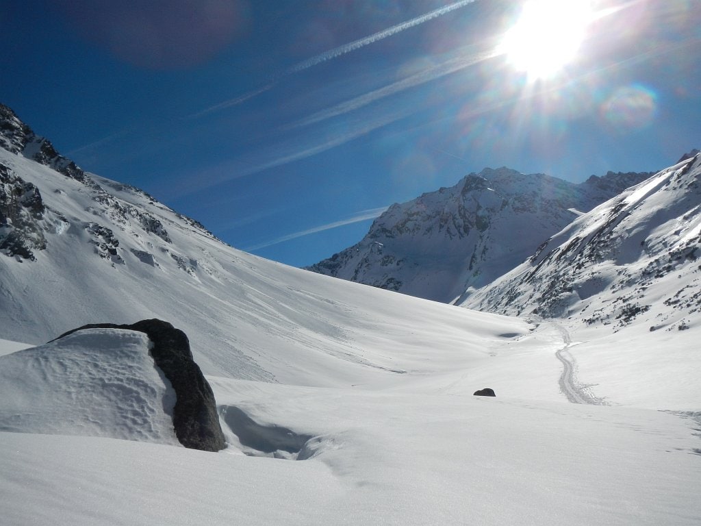 Die Bedingungen und der Lawinenlagebericht für Samstag konnten nicht besser sein, also setzten wir unseren Plan in die Tat um. Wieder ging es dafür erst mal hinab ins Längental. Doch schon bald erreichten wir die Abzweigung zum Hohen Seeblaskogel. Wir hielten uns rechts und nun marschierten wir mit zahlreichen Spitzkehren über einen sehr steilen Hang in das schöne Hochtal mit dem Grüne-Tatzen-Ferner. Dann folgten wir dem Talverlauf aufwärts bis wenige Meter unterhalb des Gipfels zum Schidepot. Von hier ging’s zu Fuß über leichte Felsen zum höchsten Punkt. Wieder genossen wir den herrlichen Rundumblick, mussten jedoch feststellen, dass die Wetterprognosen stimmten und sich der strahlend blaue Himmel nun bereits leicht einzutrüben begann. Einer kurzen Gipfelrast stand jedoch trotzdem nichts im Wege, bevor wir wieder unsere Schi anschnallten. Der Hohe Seeblaskogel (3235m) machte seinem Ruf, eine steile Firntour im Längental zu sein, alle Ehre und so erreichten wir mit strahlenden Gesichtern und mit dem Fallen der ersten Schneeflockerl wieder das Westfalenhaus.