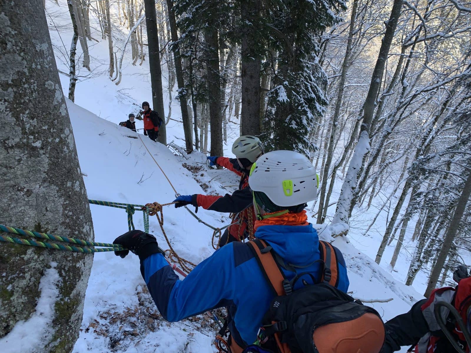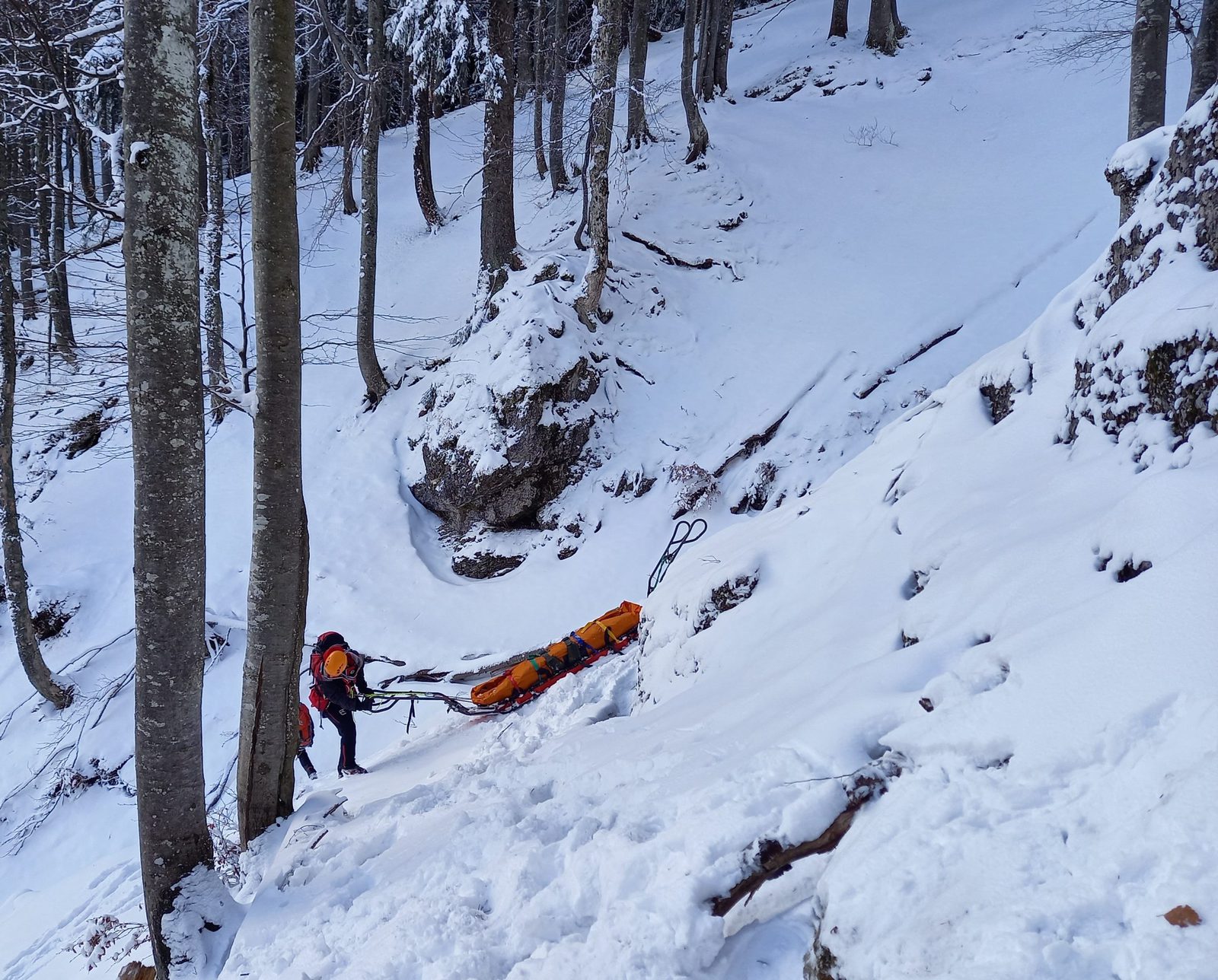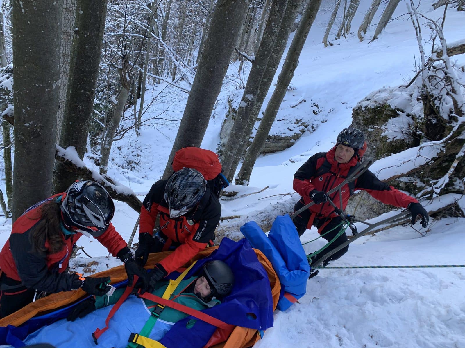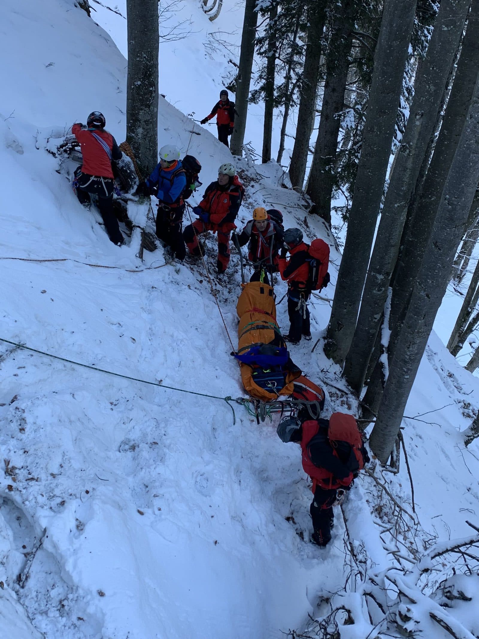 Kurz darauf trafen sie auch schon bei mir ein und ich bekam gleich als erstes eine Wärmedecke. Eine Bergretterin kümmerte sich um meinen verletzten Fuß und legte mir eine Schiene an, damit sie mich aus meiner misslichen Lage zwischen den Bäumen befreien können. Nach einem kurzen medizinischen Check und ein paar Fragen konnte ich am Funk auch schon mithören, dass weitere Bergretter mit Material für den Abtransport gleich bei uns sein werden. Die beiden Bergretter blieben die ganze Zeit bei mir, erklärten mir was sie als nächstes machen werden und informierten mich, dass bereits eine nachgekommene Bergrettungsärztin meinen Vater betreut.